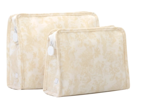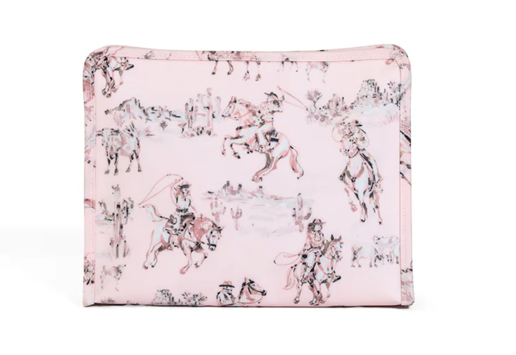 Available in 2 sizes Roadies are made in a cotton gingham with a thin Eco-friendly matte coating, an inside slip pocket and exterior snap open zip tabs for a wider opening and an easier access.
