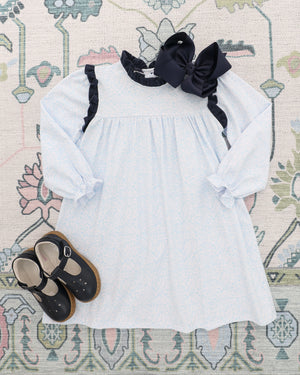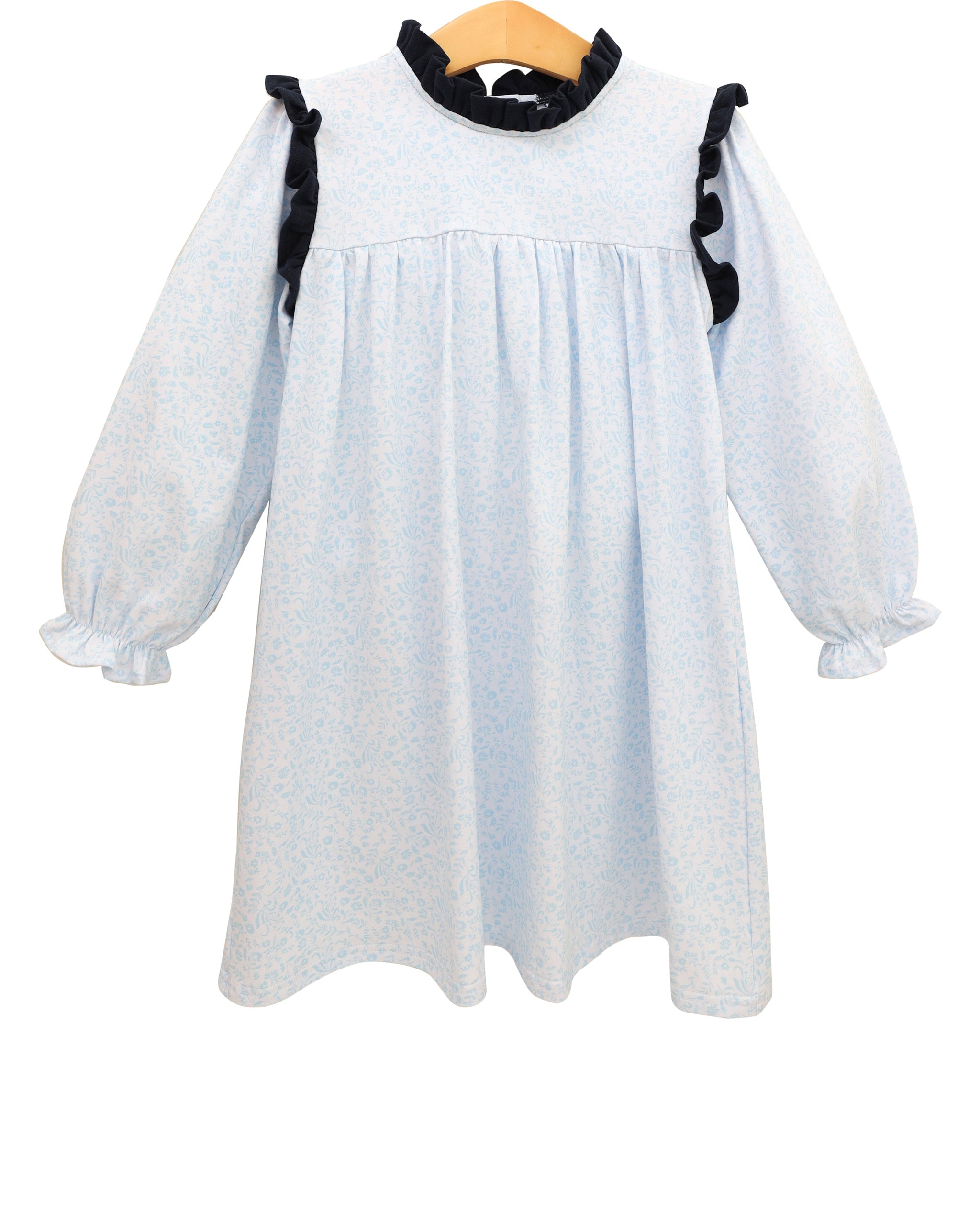 This adorable long sleeve dress features a delightful navy ruffle collar that perfectly complements the whimsical blue floral print. Perfect for fall adventures, playdates, or family photos.